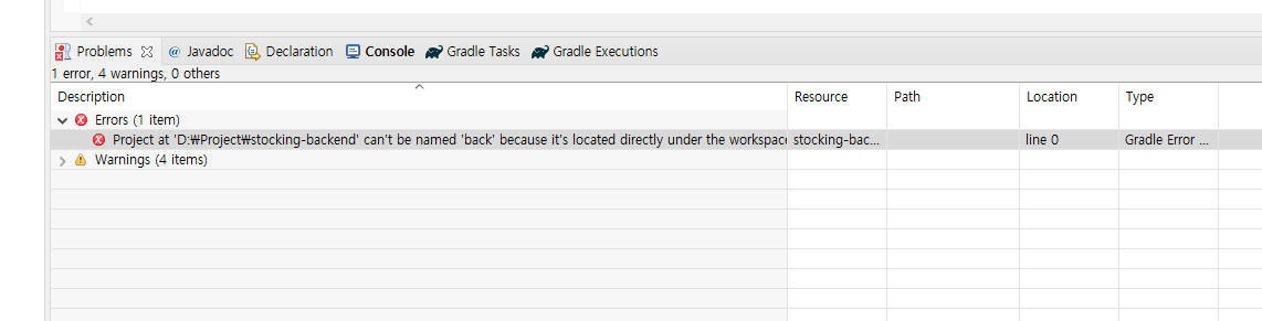Description Resource Path Location Type Project at 'D:\Project\stocking-backend' can't be named 'back' because it's located directly under the workspace root. If such a project is renamed, Eclipse would move the container directory. To resolve this problem, move the project out of the workspace root or configure it to have the name 'stocking-backend'. stocking-backend line 0 Gradle Error Marker