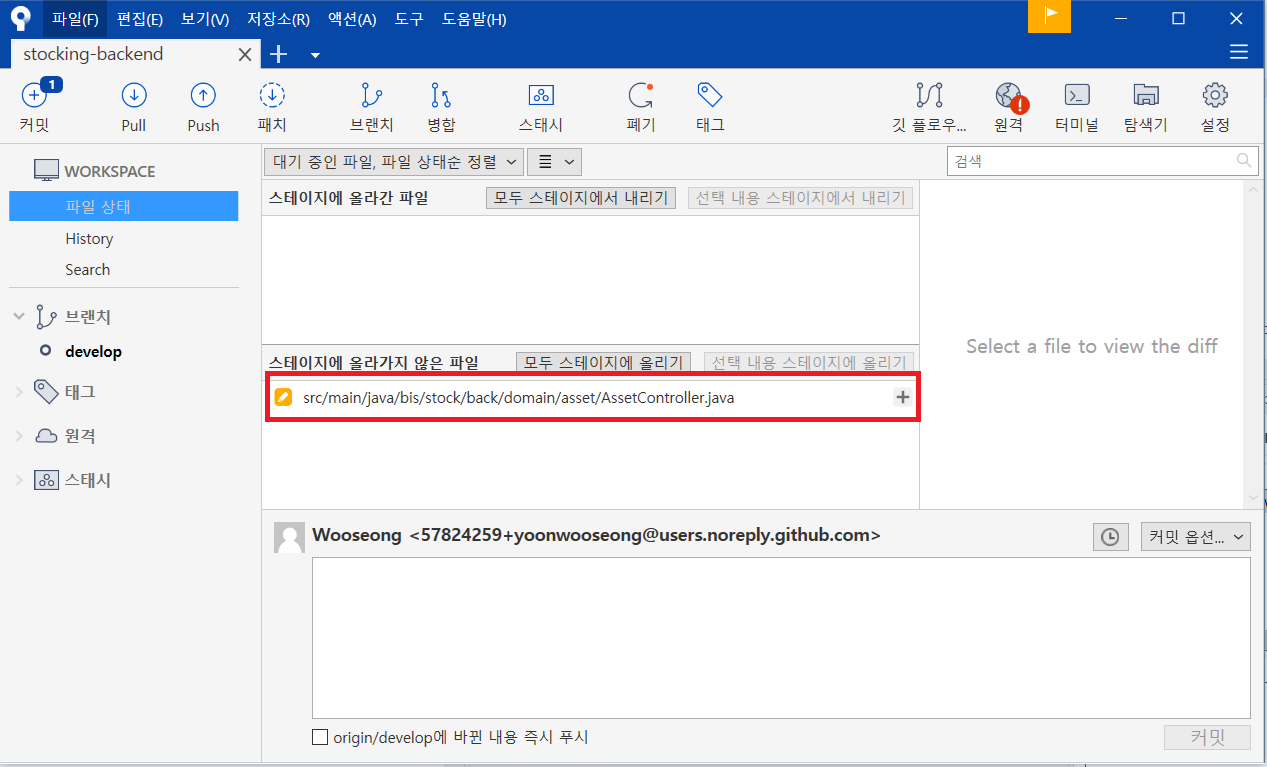 푸시하고자 하는 브런치를 선택하여 Push한다.