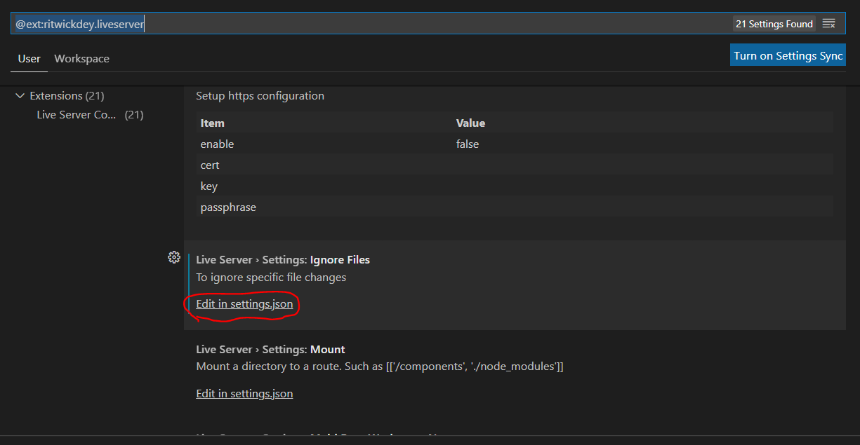 2. 검색창에 @ext:ritwickdey.LiveServer 을 입력한 후 아래 캡처 화면처럼 Ignore Files를 찾아 Edit in settings.json 클릭