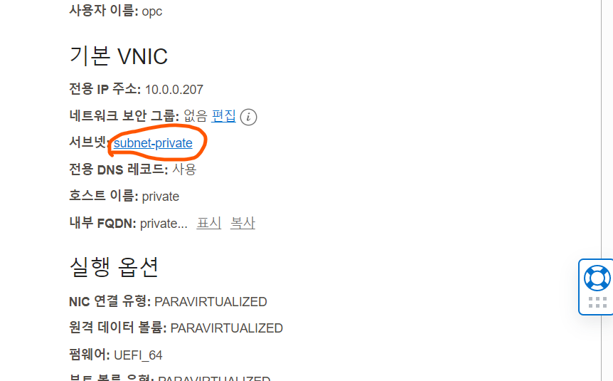 2) 인스턴스 정보 오른쪽 부분의 기본 VNIC 중 서브넷 선택