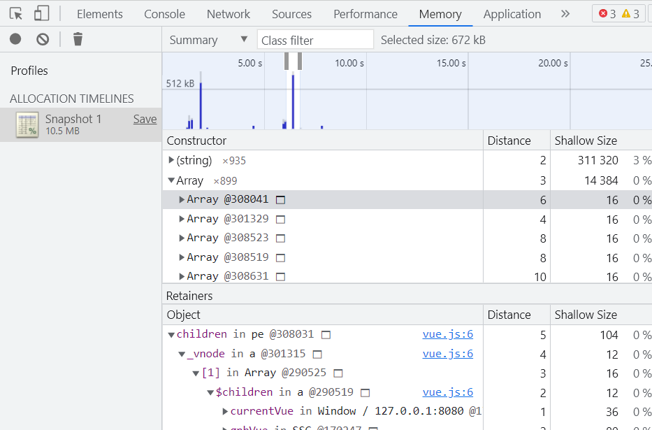 메모리 누수를 해결하기 위해 첫번째로 Memory 탭의 타임라인을 이용하여 반환되지 못하는 부분의 Object들을 확인합니다. 확인된 Object들의 소스 상에서의 위치 및 쓰임새를 파악하고 Vue의 구조, 객체의 참조를 분석하며 문제점을 찾습니다. 그 후 해당하는 Object들을 참조하는 객체들을 초기화 시켜주거나 불필요한 요소는 지웁니다. 앞서 말한 과정을 반복하며 누수가 발생하지 않도록 개선하였습니다.