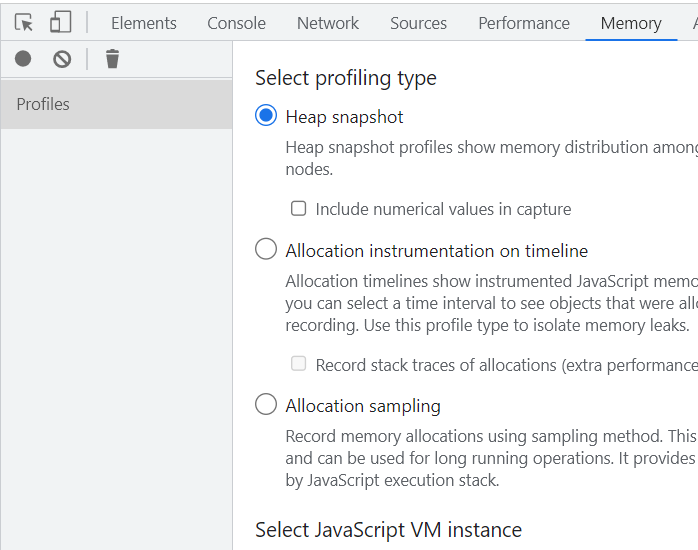1. Memory 탭에서 profiling type을 snapshot으로 설정한다.
