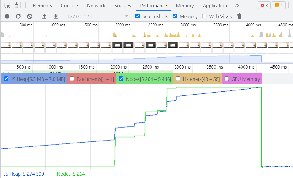 Performance 확인 결과 JS Heap, Nodes가 GC(가바지 컬렉터)가 실행되었음에도 반환되지 못하는 노드가 있기 때문에 같은 동작을 반복할 경우 메모리와 노드가 쌓여 어플리케이션이 다운될 수 있습니다.