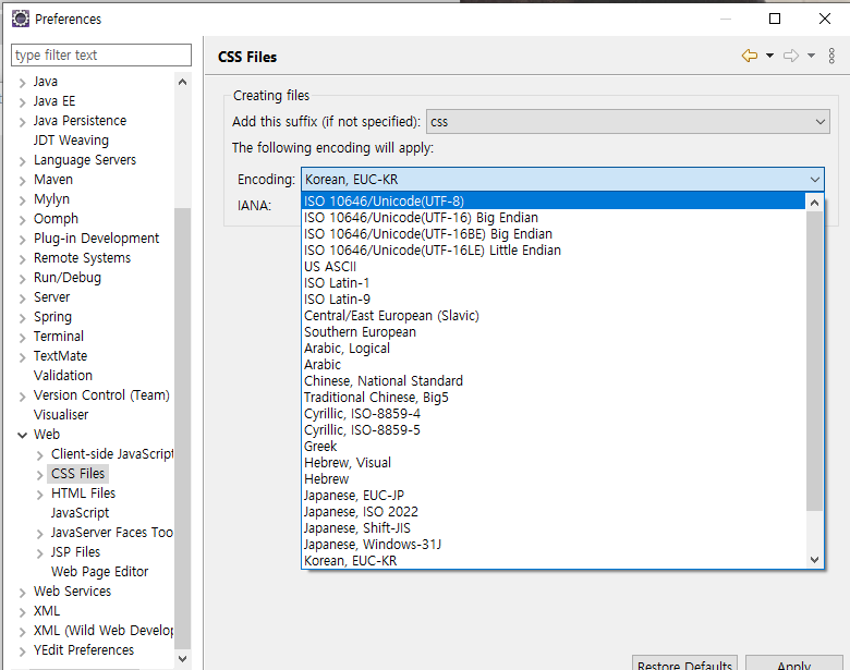 - Web -> CSS Files에서 Encoding을 ISO 10646/Unicode(UTF-8)로 바꿔준다. (여기서 HTML Files, JSP Files도 같이 변경해준다.)
