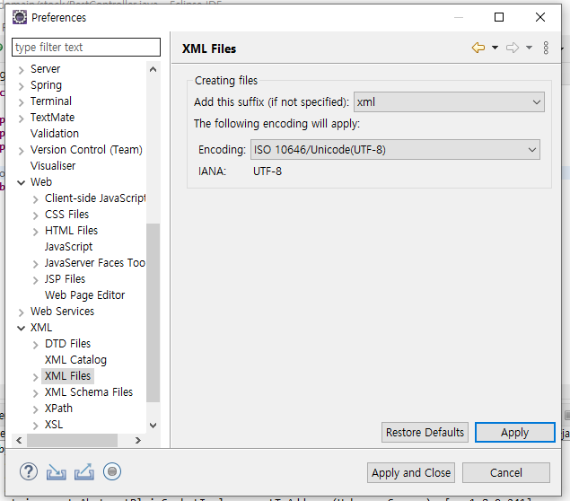 - XML -> XML Files에서 Encoding을 ISO 10646/Unicode(UTF-8)로 변경해주면 된다.