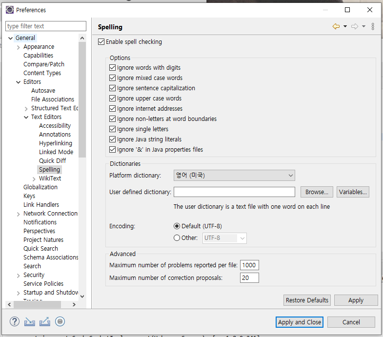 - General -> Editors -> Text Editors -> Spelling 에서 Encoding을 UTF-8로 변경