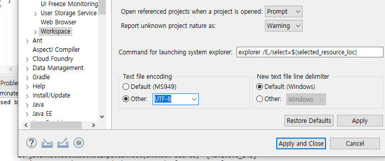 - General -> Workspace에서 Text file encoding을 UTF-8로 바꿔준다. (필자는 여기서 해결되었다.)