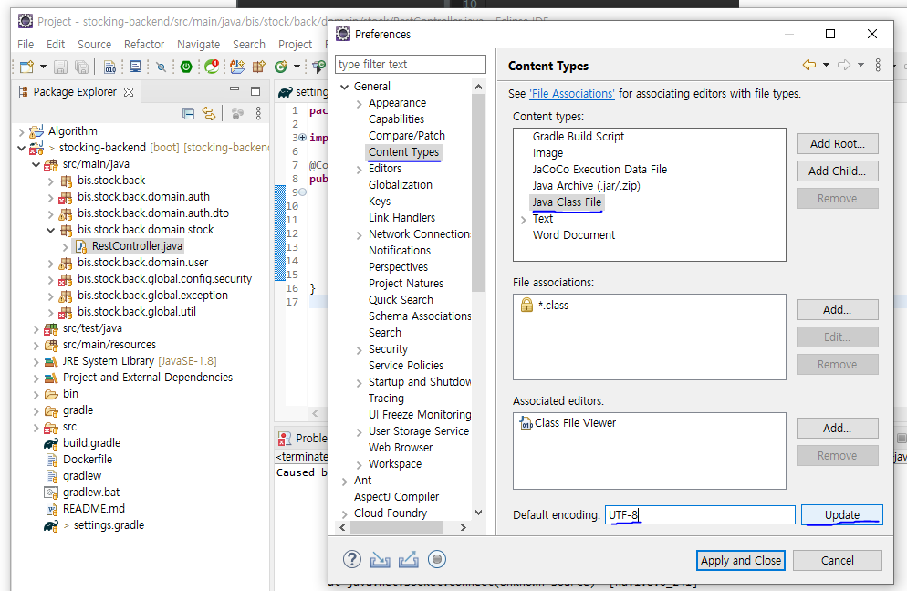 - General -> Content Types -> Java Class File 클릭 후 아래의 Default encoding 칸 : UTF-8 을 타이핑 후 적용