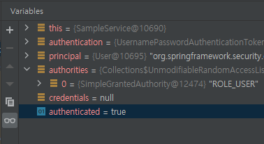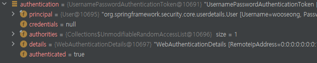 -> Authentication 타입의 구현체인 UsernamePasswordAuthenticationToken 객체가 SecurityContextHolder안에 Authentication으로 담기는 것이다. - authentication의 principal(User) = UserDetailsService에서 반환한 User