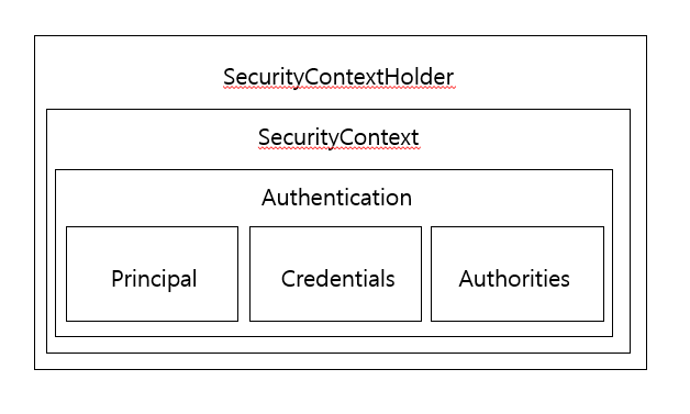 - Authentication : principal, authorities, credentials을 담고 있는 객체