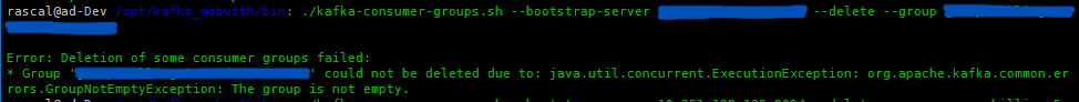Consumer를 개발서버에서 테스트하며 생성했던 현재는 불필요한 Consumer Group 정리를 진행하였습니다. 개발서버에서 Kafka Consumer의 Group을 삭제하기 위해 명령어를 입력했더니 다음과 같은 에러 메세지와 함께 실패하였습니다.